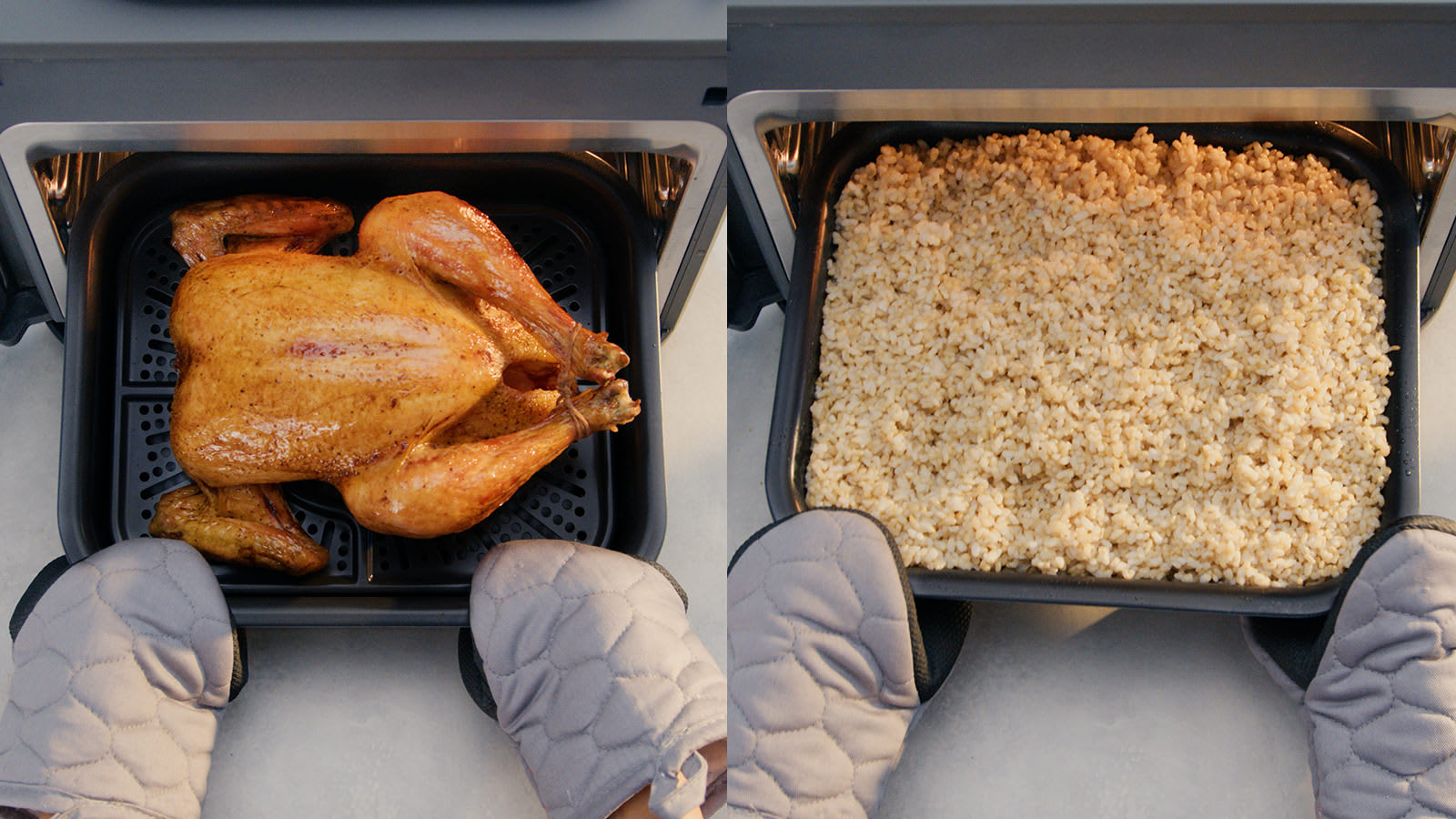 Pożegnaj się ze stresem związanym z szykowaniem posiłków i korzystaniem z wielu urządzeń. Pojemność 12,5 l Combi pozwala na jednoczesne gotowanie dania głównego i dodatków, zapewniając bezproblemowe, trzydaniowe posiłki rodzinne w zaledwie 15 minut*. A ponieważ jest to multicooker, frytkownica beztłuszczowa i piekarnik w jednym, możesz już nigdy nie chcieć używać piekarnika konwekcyjnego lub płyty grzejnej. Gotowanie wielu potraw jednocześnie – nawet z mrożonych składników.